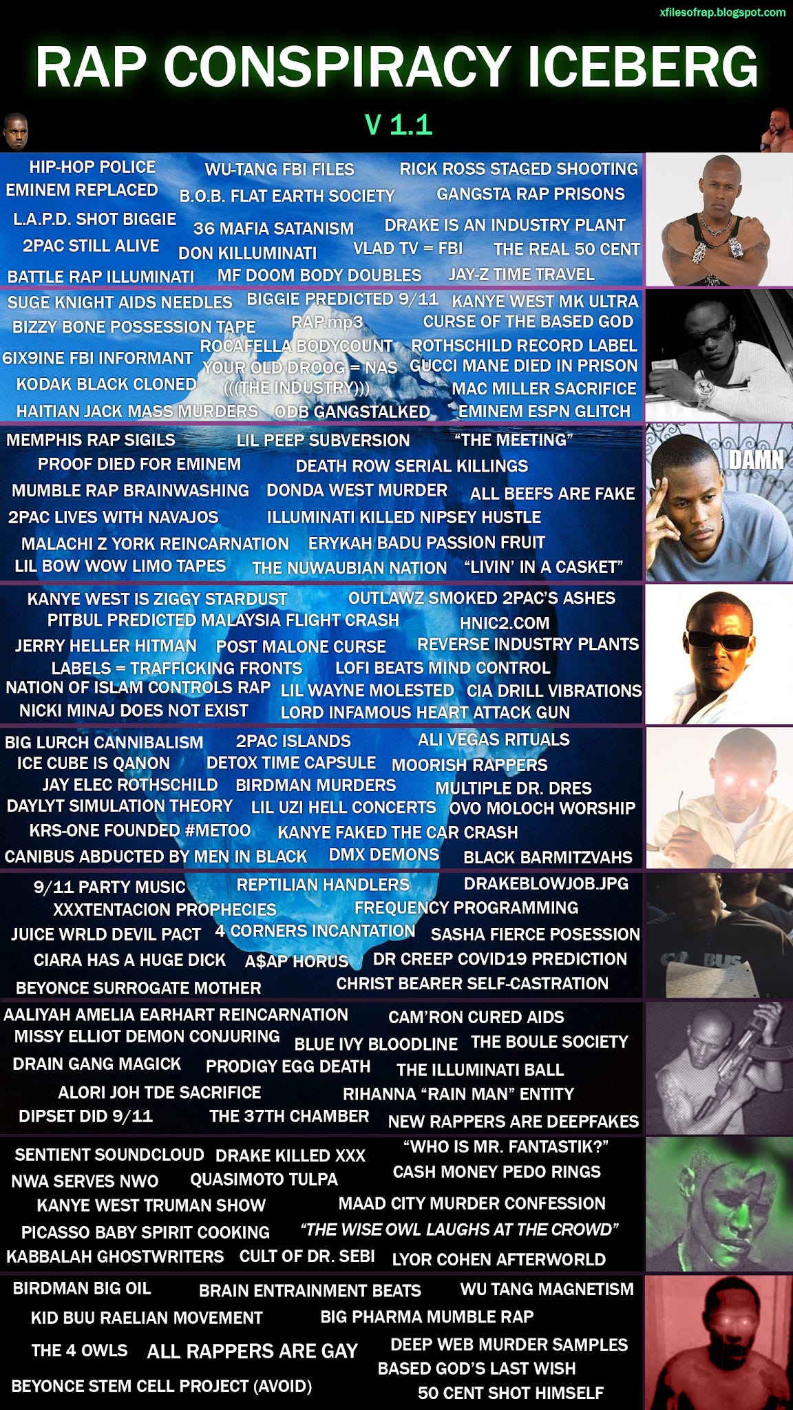 Since the last newsletter, I have spent most of my time investigating the conspiracy iceberg of rap from the good folks at X-Files Of Rap.